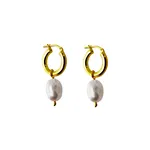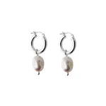 Each earring features an oval-shaped freshwater pearl suspended from a 1.5cm diameter sterling silver hoop.