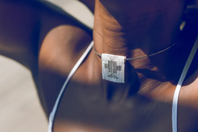 Ndebele style hand beaded pendant on hand beaten sterling silver choker. Razor pattern.
