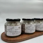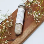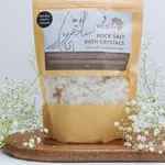 Rock Sea Salt Crystals, Simmondsia Chinensis (Jojoba) Oil, Magnesium Sulfate, Sclerocarya Birrea (Marula) Seed Oil, Adansonia digitata (Baobab) Seed Oil, Prunus dulcis (Sweet Almond) Oil, Tapioca Starch, Essential Oils.