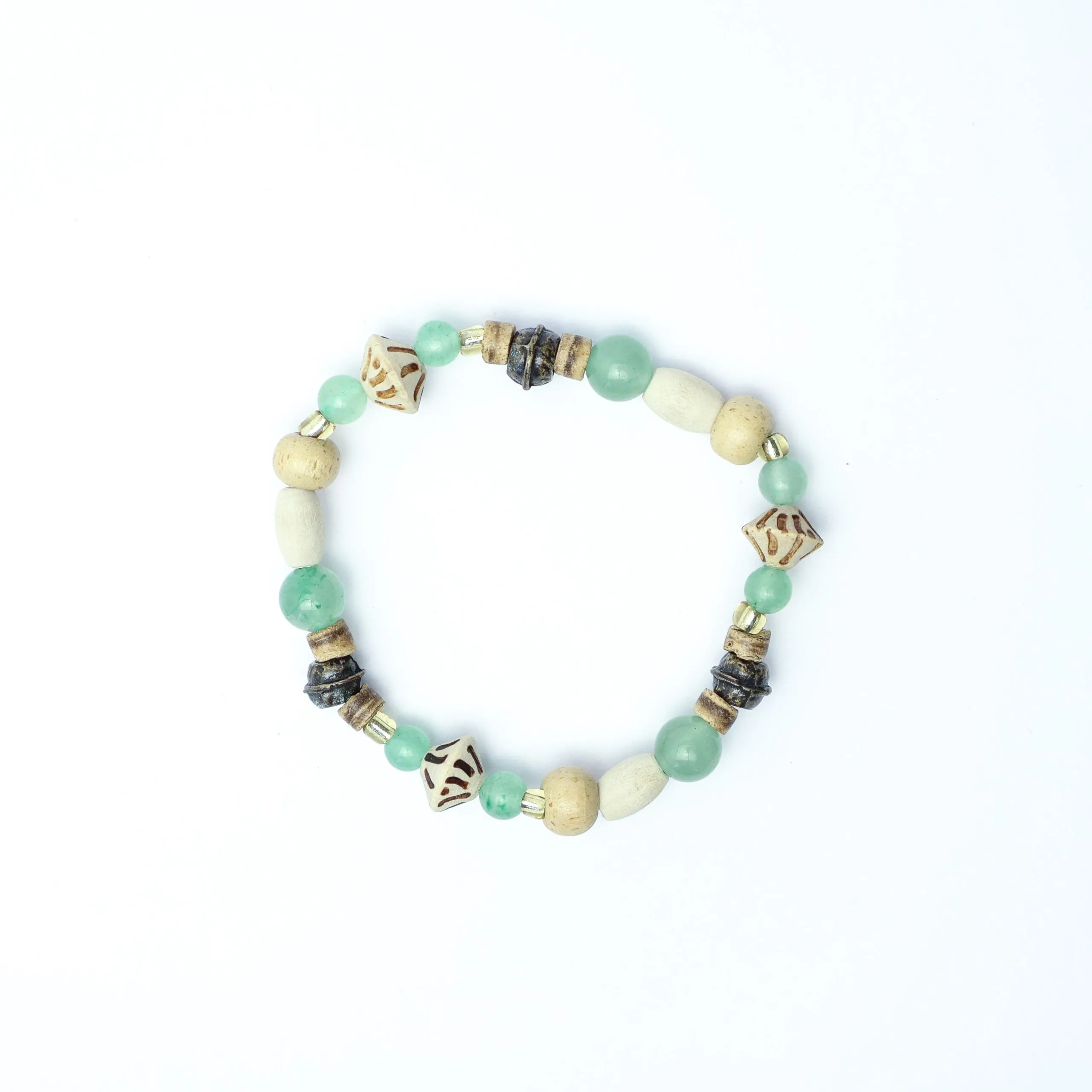 A Bracelet made with Green Aventurine Gemstones, Wood and Antique Brass