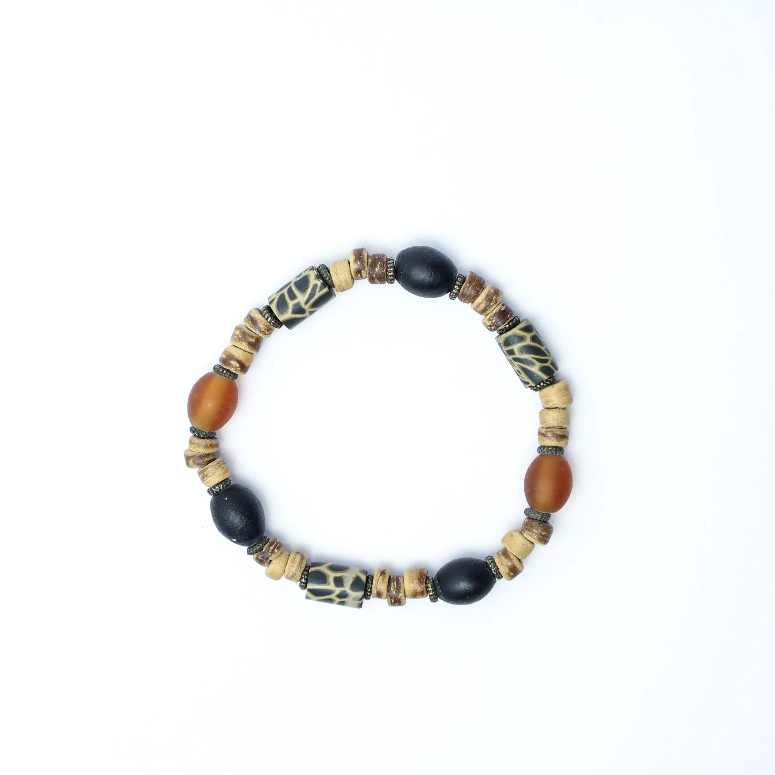 Amber and black frosted glass bracelet with coconut wood and animal print polymer clay