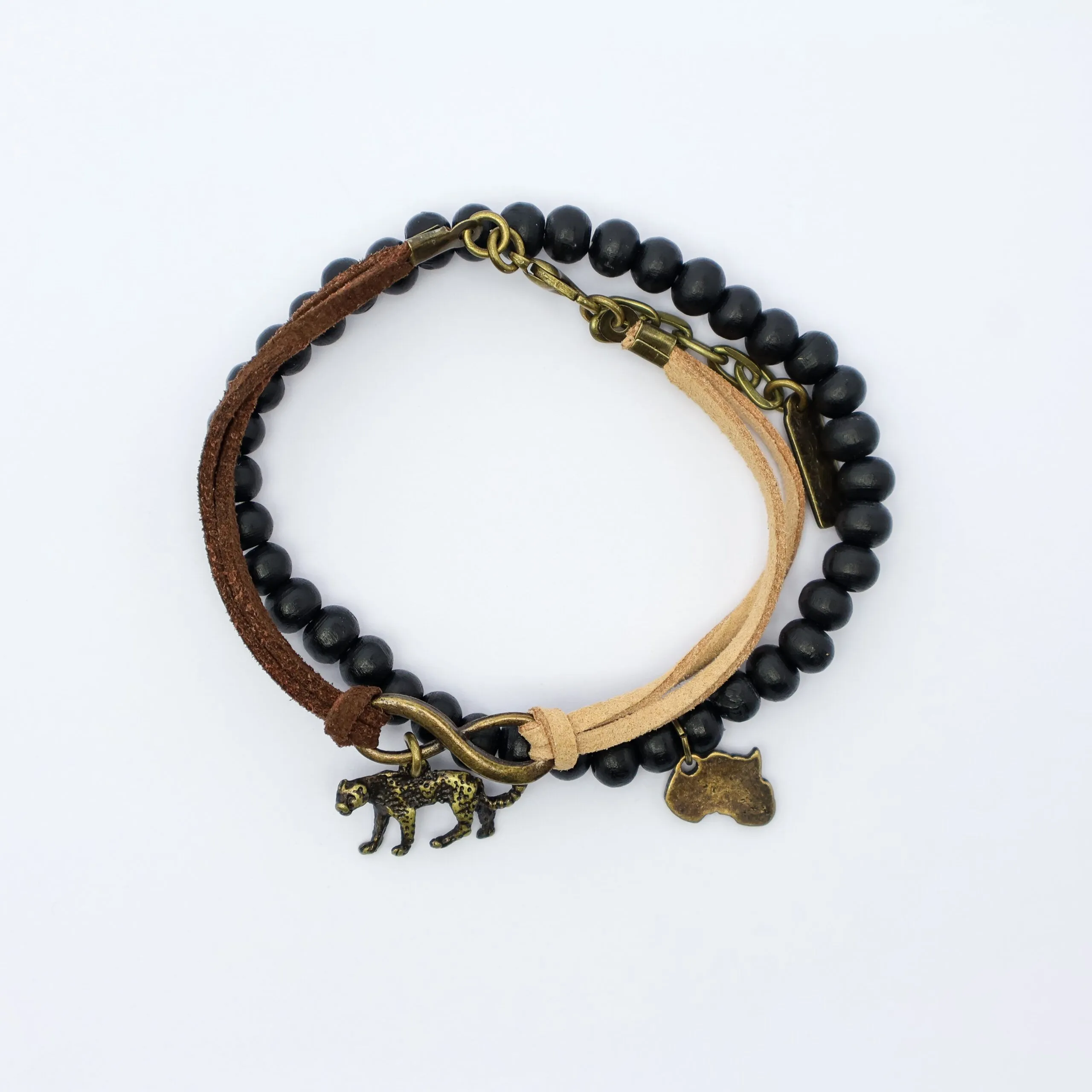 Black Wood with Faux Suede with Antique Brass Infinity Symbol and Antique Brass Charms. Different Animal Options Available