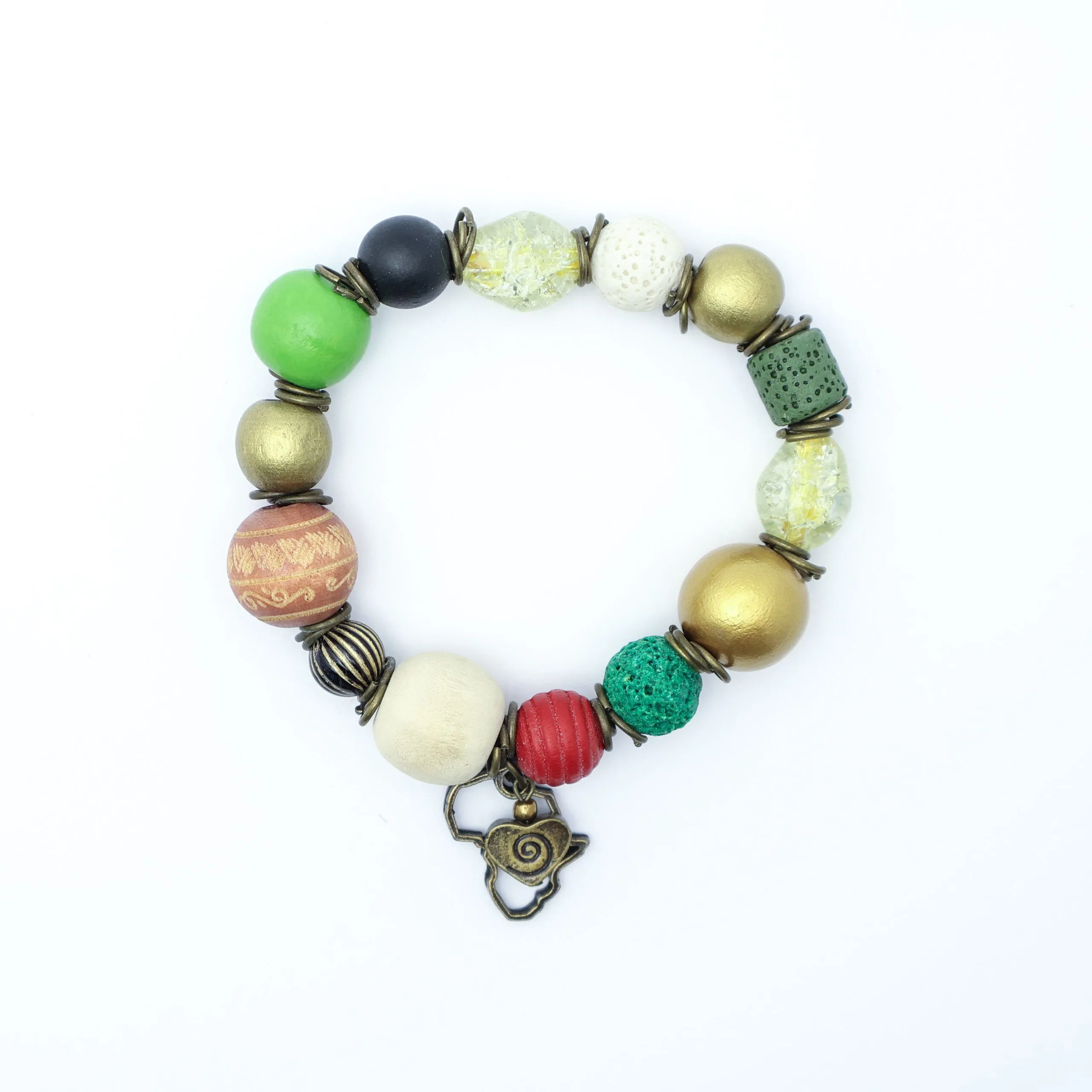 Antique Brass Heart with Africa and Assorted Beads on Elastic
