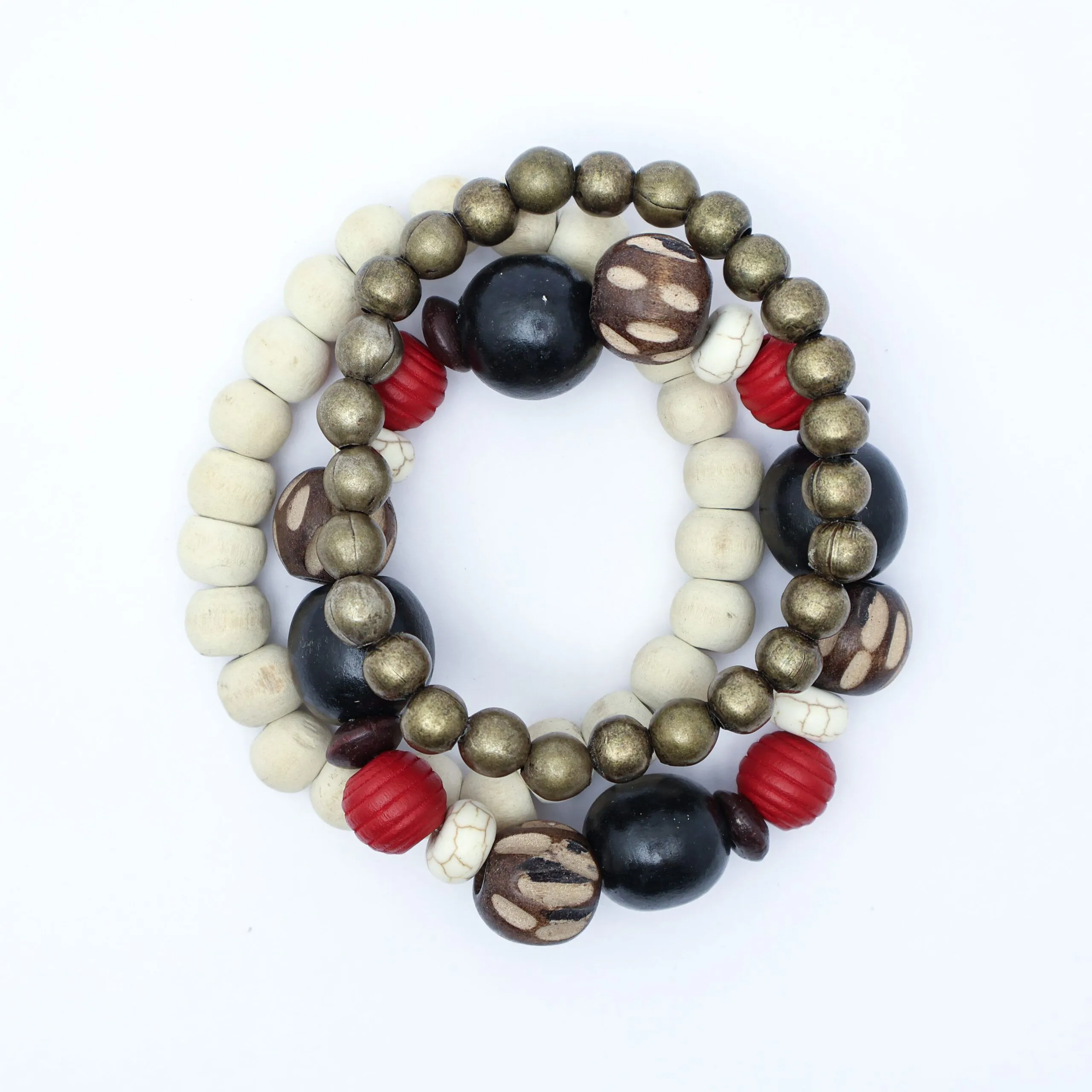 Set of 3 bracelets on elastic: antique brass metal beads; bleached wood, carved wood and other wood with howlite stone rondelles.