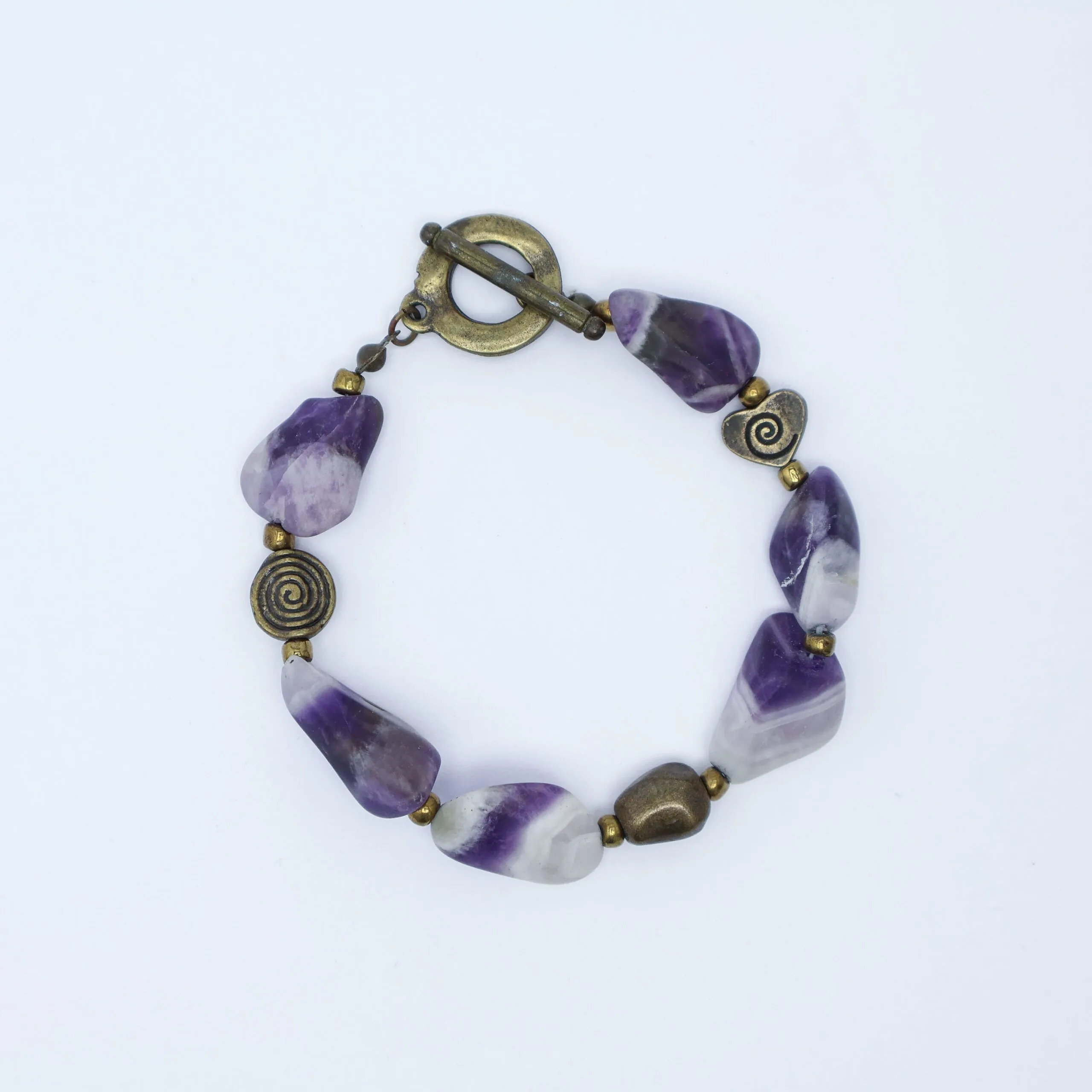 Tumbled Banded Amethyst Bracelet with Antique Brass and Small Glass Beads.