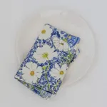 Crafted from locally produced fabric made from 100% recycled PET bottles, these napkins are not only durable and long-lasting but also a sustainable choice for the planet. The exquisite prints of Cosmos flowers on a vintage delft background bring a delightful blend of elegance and whimsy to your meals.
