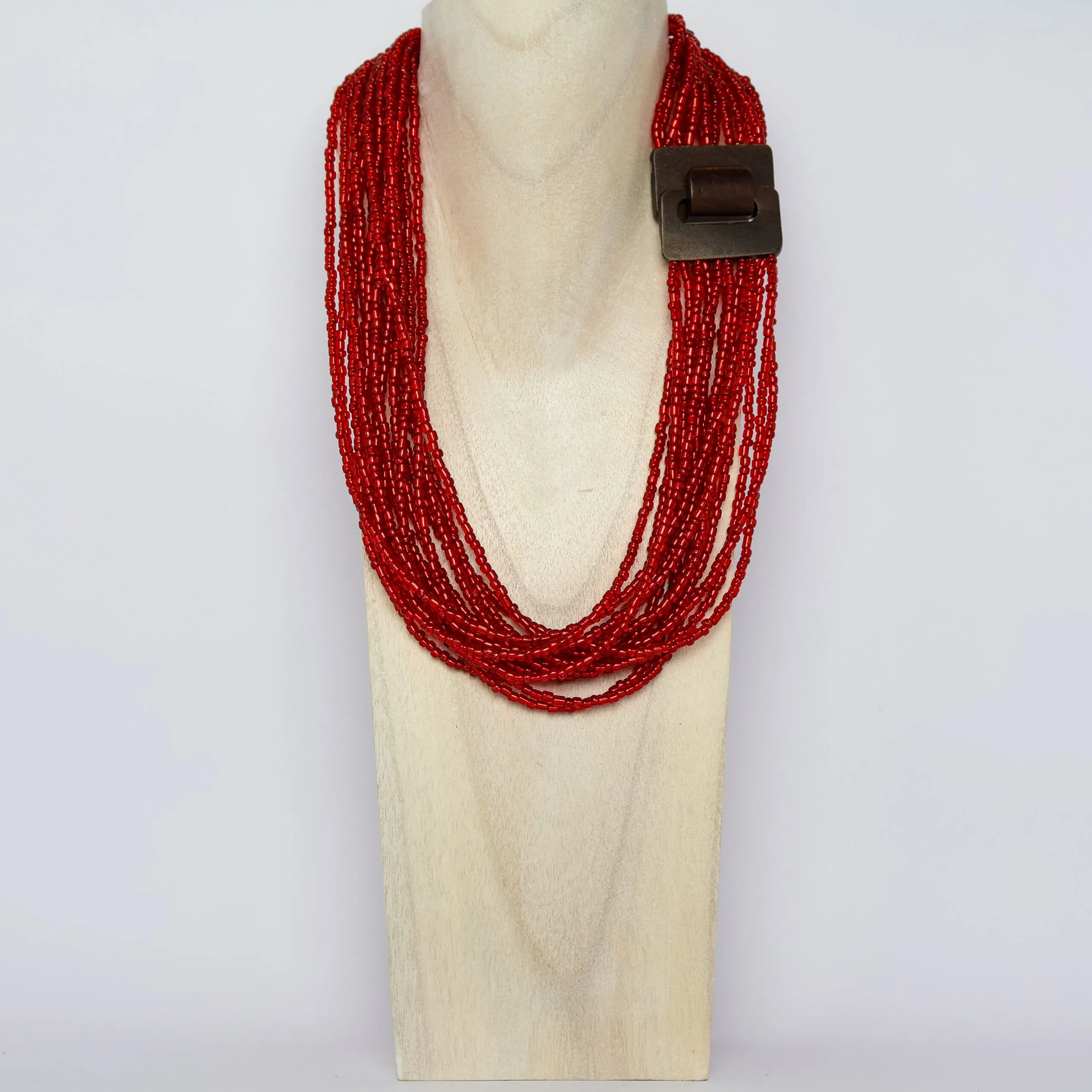 Chunky Red Seed Bead Necklace with a Wooden Buckle Detail
