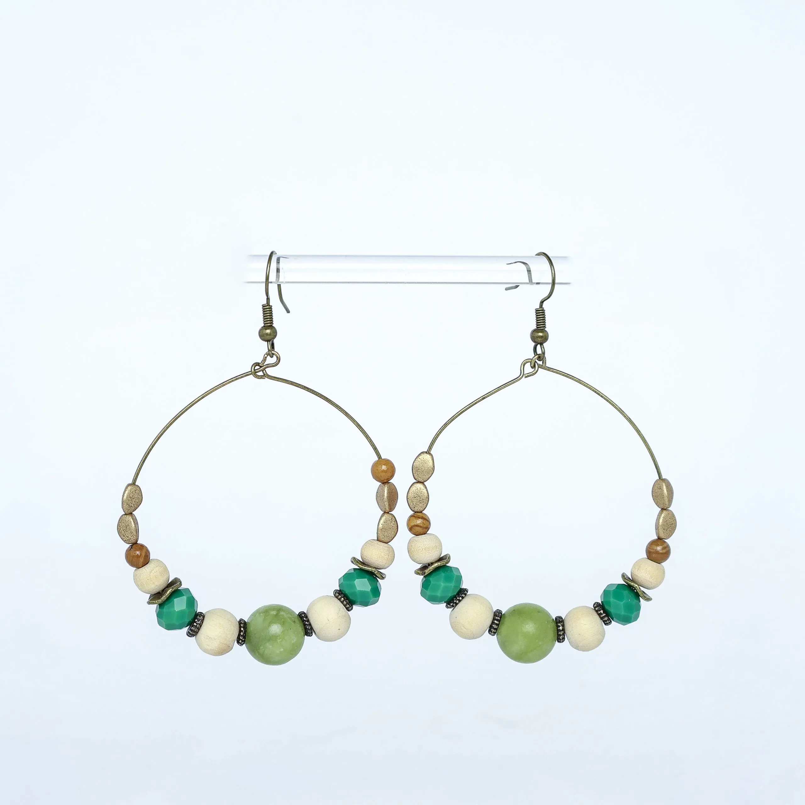 Antique Bronze Hoops with Chinese Jade, Wood, Czech glass and Wood