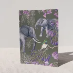 Immerse yourself in the world of delicate Jacaranda flowers and elephants, as illustrated by the talented Megan L. Potgieter and Ann C. Jooste, their majestic presence brought to life against an olive green backdrop.