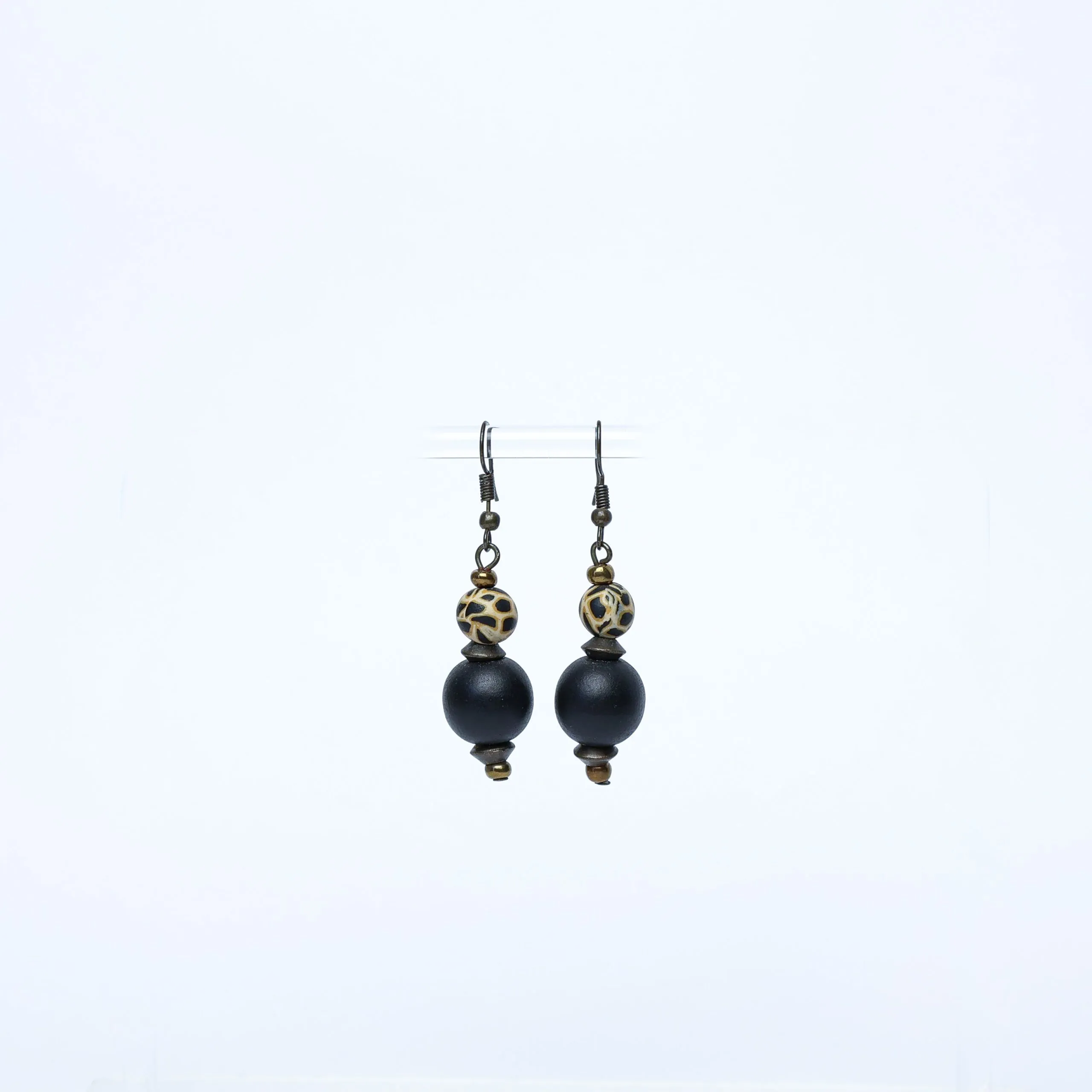 Black Wood with Animal Print Polymer Clay, Antique Brass and Glass Earrings