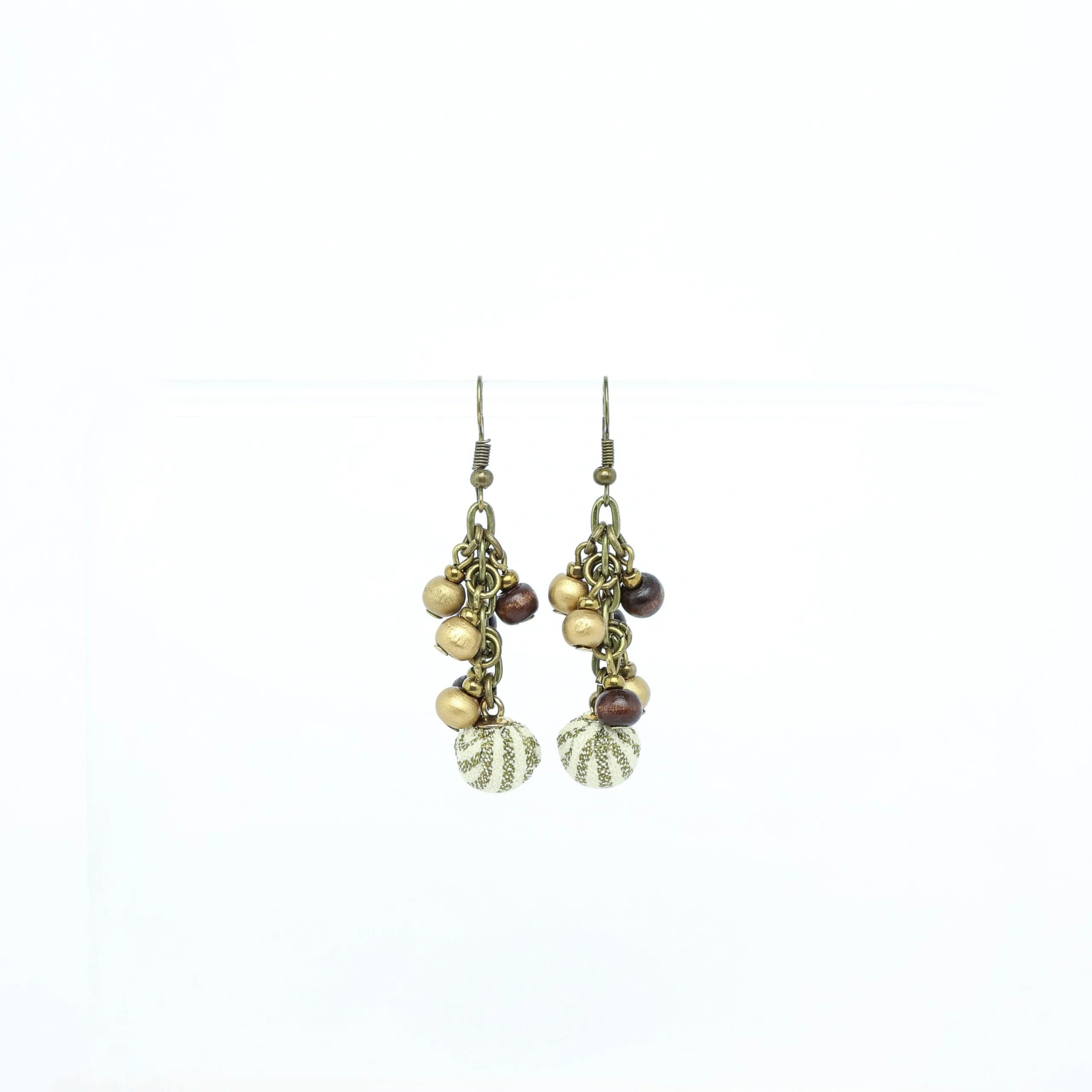 Beige and Cream Striped Fabric Baubles with Wood On Antique Brass Earring Hooks