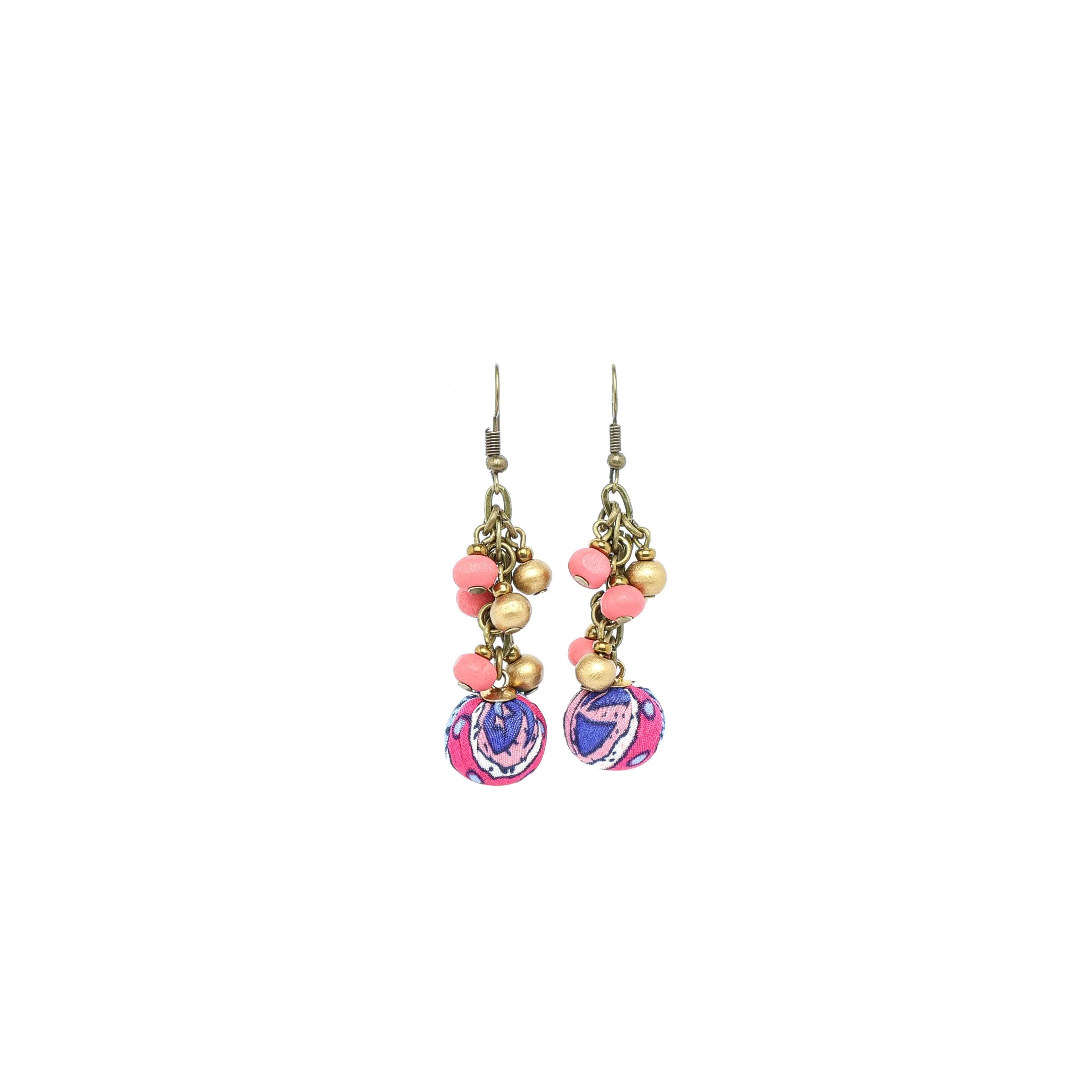 Blue and Red Fabric Baubles with Wood on Antique Brass Earring Hooks