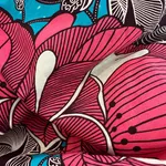 BRIGHT PINK , CREAM AND BROWN FLOWERS ON A BLUE TURQUOISE BACKGROUND. THE OUTLINES ARE BROWN.