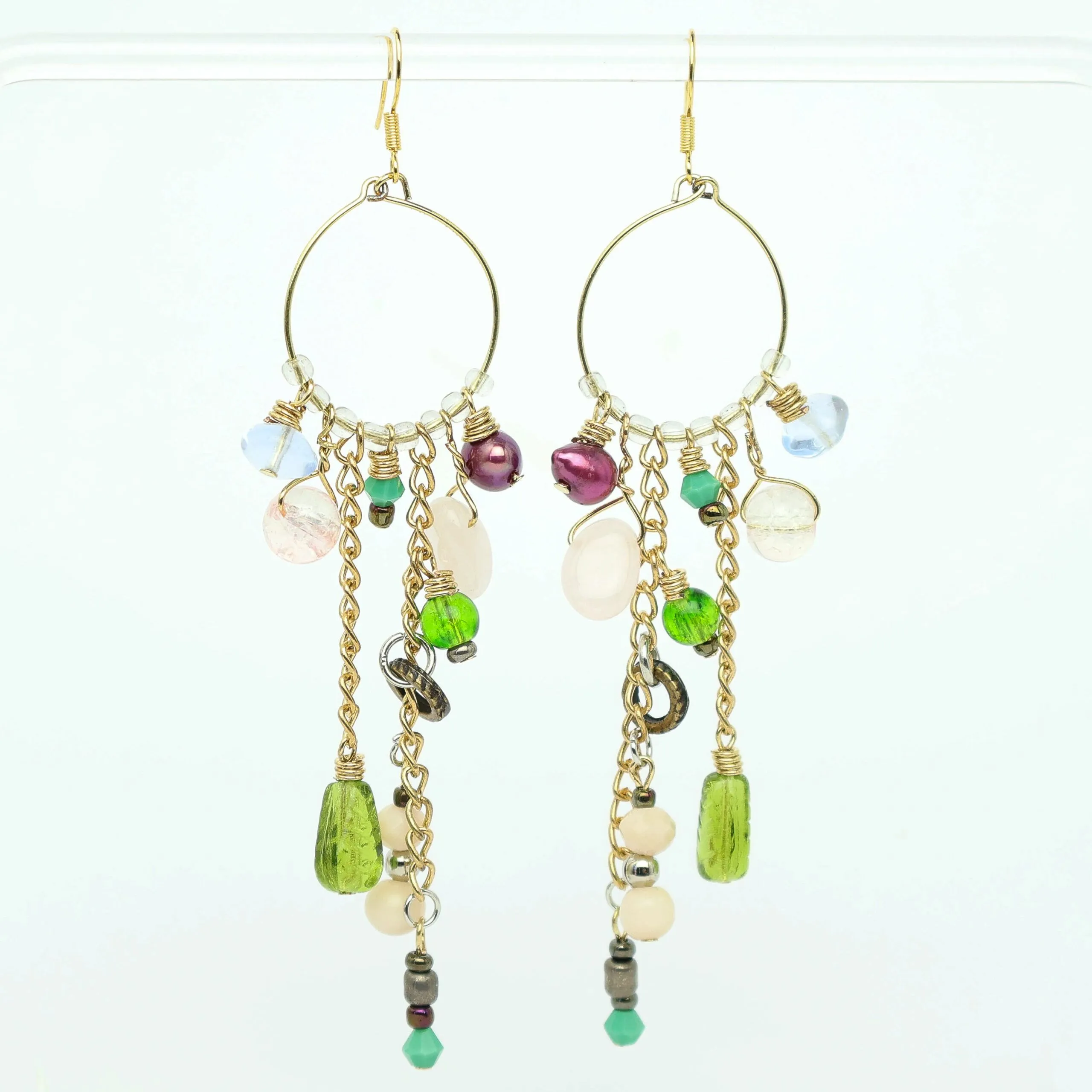 A pair of earrings on 25mm gold hoops with a selection of beads and stones, picked to match the colours of South African Protea.