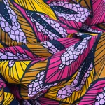 A REPETITION OF TANGERINE, FUCSIA, PASTEL PINK AND YELLOW LEAFES. THE OUTLINES ARE BLACK.