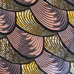 MOCHA BROWN WAVES ON A TRADITONAL YELLOW AND WHITE BATIK  PATTERN. THE OUTLINES ARE BLACK.