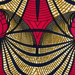 RED AFRICAN FLOWERS ON A TRADITONAL BEIGE AND WHITE BATIK PATTERN . THE OUTLINES ARE BLACK.