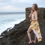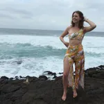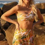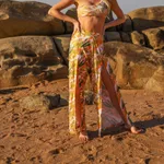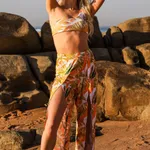 These stunning soft Juicy Tropics Flaired Summer Pants will make you feel fab this summer. Wear them with your matching one shoulder juicy tropics bikini or dress them up for daywear or even for an evening beach party look! This poly-knit drawn and twisted yarn fabric is super soft and stretchy. They come with an elastic wasitband in sizes XS to XL and with a mid thigh slit on each leg, they are as cool and breezy as it gets! Juicy Tropics Print by local graphic designer @liammacsweeney
