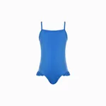 Introducing the Kids One Piece in Indigogo: She’s a fun and exciting shade of blue for that little adventurer. The younger kids' sizes (ages 3-4 and 5-6) feature a charming frill, while the older kids' sizes opt for a sleek, frill-free design. Our Kids One Piece is designed with a modest scooped neck and back.