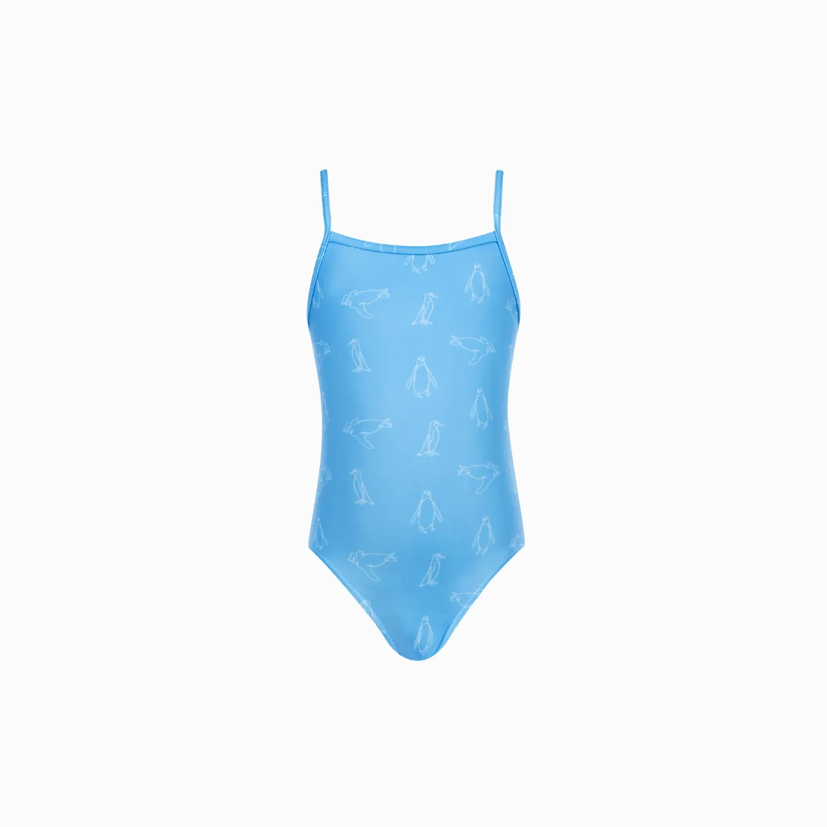 Introducing the Kids One Piece in our playful Penguin parade. Set against a ocean blue background, featuring cheeky little penguins waddle across this print, bringing a sense of fun and whimsy to your beach day.