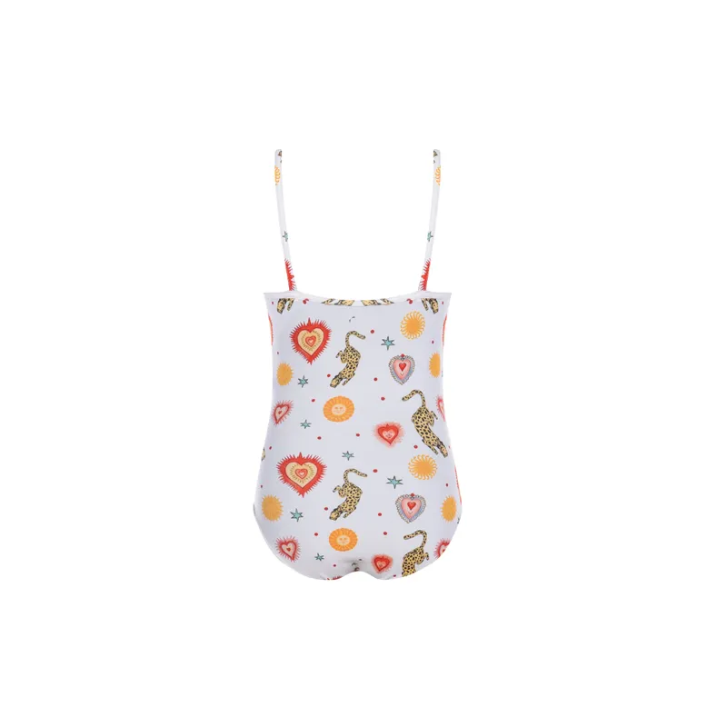 Introducing the Kids One Piece in Sphinx: adorned with the captivating Sphinx print on milk, it embodies the playful spirit and vibrant energy kids love to embrace. Our Kids One Piece is designed with a modest scooped neck and back flattering for young adventurers.