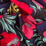 NAVY BLUE BACKGROUND SHOWCASING RED AND PINK FLOWERS. HINTS OF AQUA AND YELLOW.