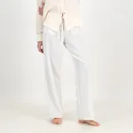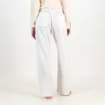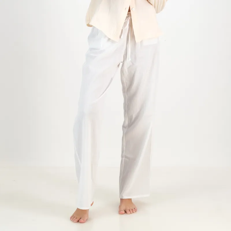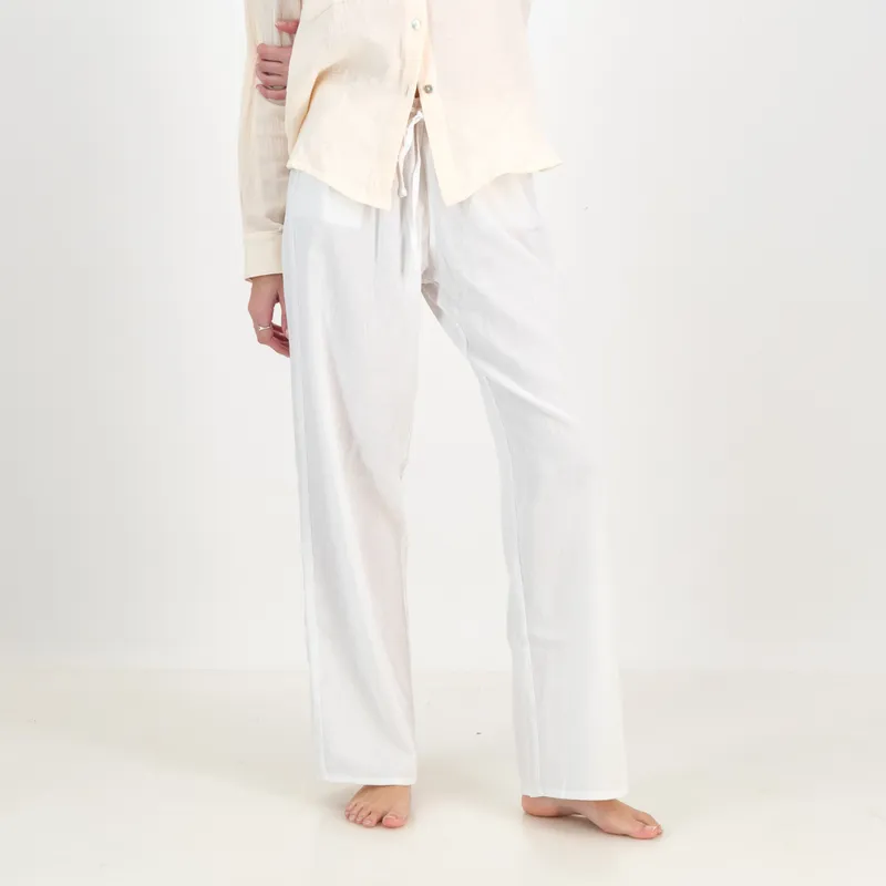 The linen trousers are a relaxed wide leg style with an elastic waist and draw cord. The trousers are styled to sit high or mid-rise. The fabric is natural and lightweight.