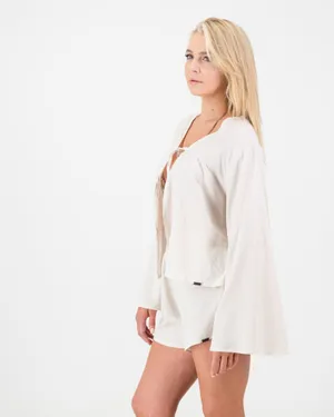 These shorts are the perfect every day summer go to. They are high waisted and have an elastic waist with a draw cord. They are a very lightweight fabric which is perfect for the summer. The shorts come in white and cream and can be matched with the long sleeve shirt.