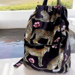 Immerse yourself in the allure of the African wilderness as our original watercolor design beautifully showcases the majestic leopards and cheetahs of southern Africa. Indulge in the velvety softness that envelops you, adorned with eco-friendly printed inks that honor our commitment to sustainability. With adjustable velvet straps, a fully lined interior, and a spacious inner pocket, this backpack combines functionality with elegance.