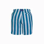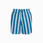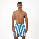 The swim shorts feature a bold vertical stripe pattern alternating between vibrant blue and off-white. The stripes are wide, giving the shorts a classic yet eye-catching appearance.