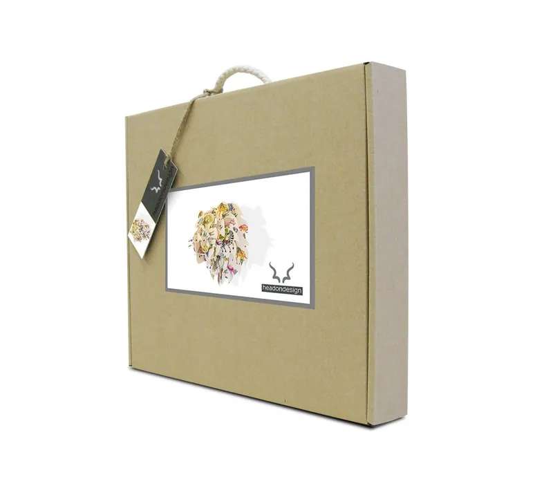 Made from recycled paperboard, this popular DIY African Lion head with an African Jungle print by well known Cape Town artist Sharon Boonzaier, is a great gift idea.