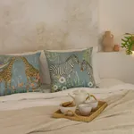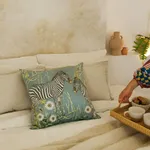 Bring a sense of tranquil elegance into your space with our Moonlit Reverie velvet cushion cover, featuring hand-painted zebras gracefully roaming among indigenous daisies, all set against a dreamy dusky blue backdrop. The soft printed velvet front is paired with a colour-matched plain back, creating a perfect balance between statement and subtlety.