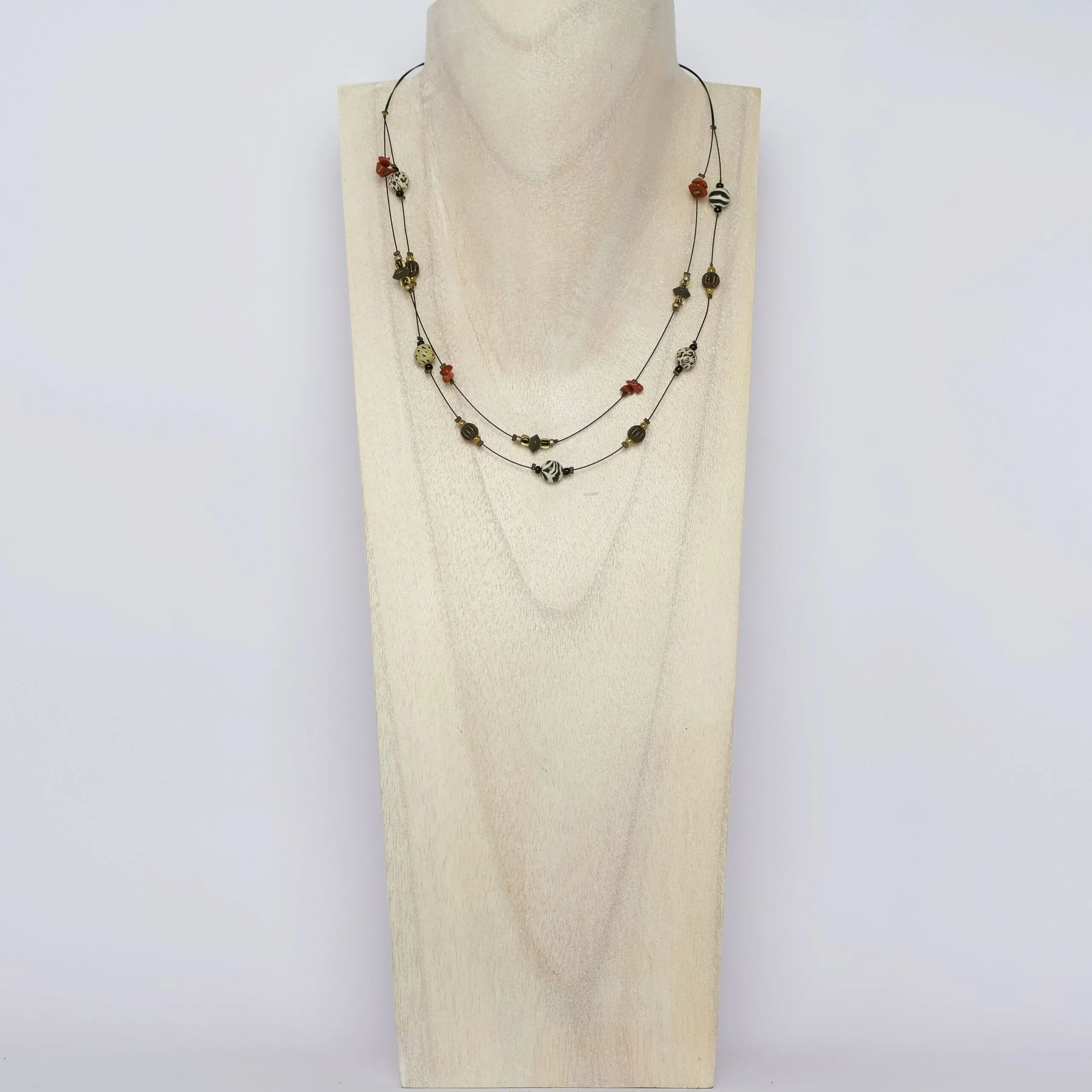 Double Strand Black Nylon Coated Wire Necklace with Assorted Gemstones Chips and Polymer Clay Beads
