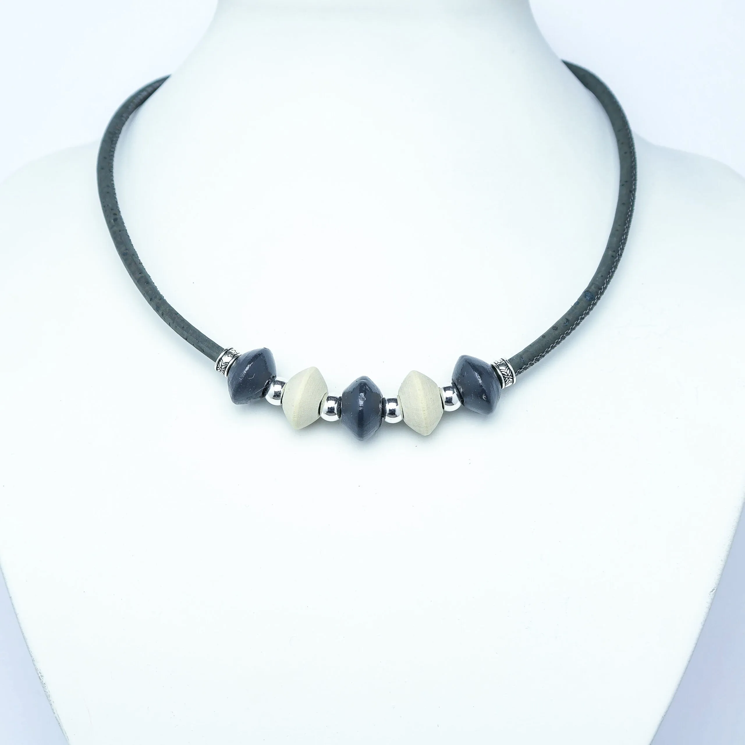 Sustainable Grey cork necklace, with wooden discs and silver colour spacers (Tan Option Available)