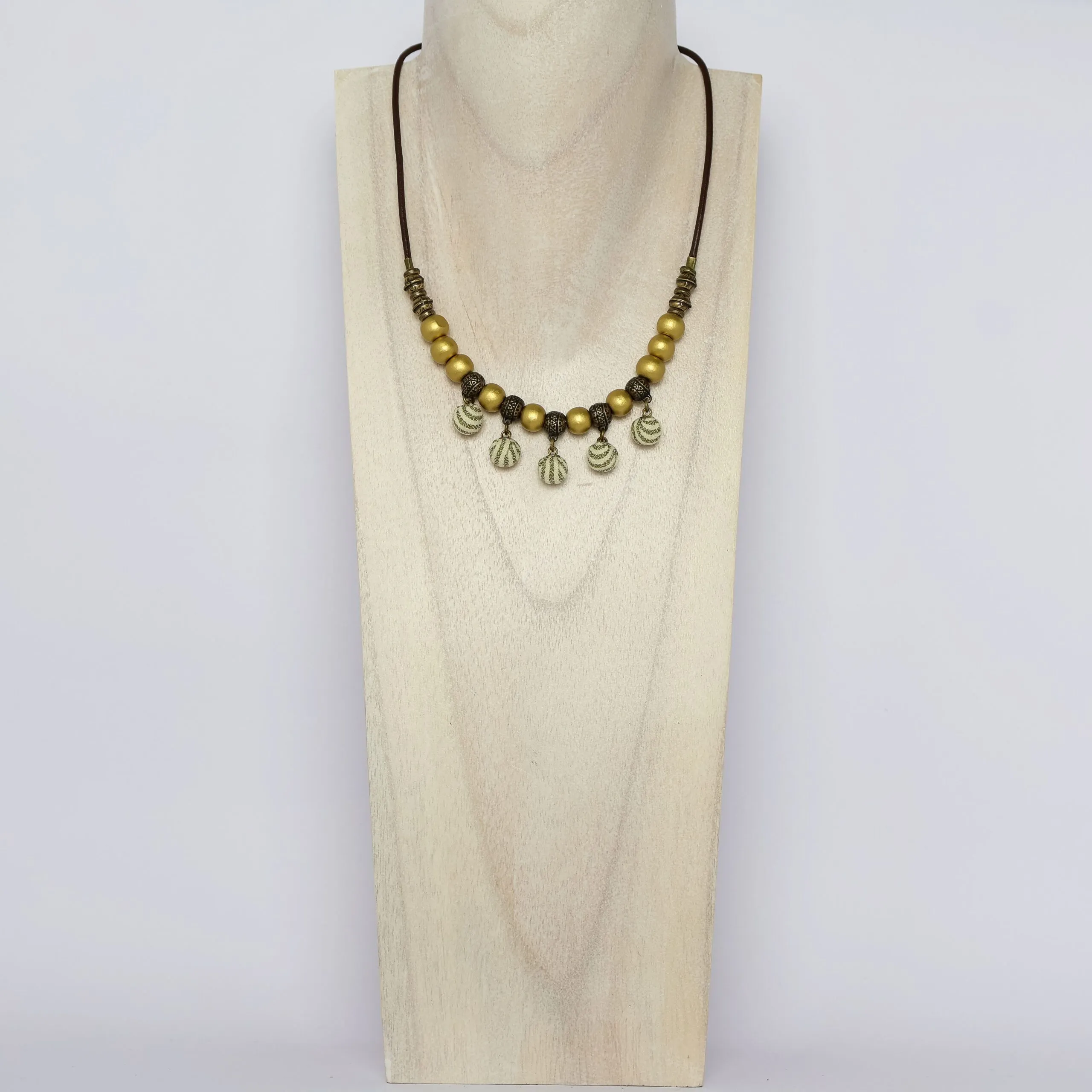 A Necklace made with Beige and Cream Striped Fabric Baubles with Wood on Leather