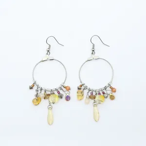 Grey leather with wooden beads and copper diamond-shaped castings, woven with ribbon.