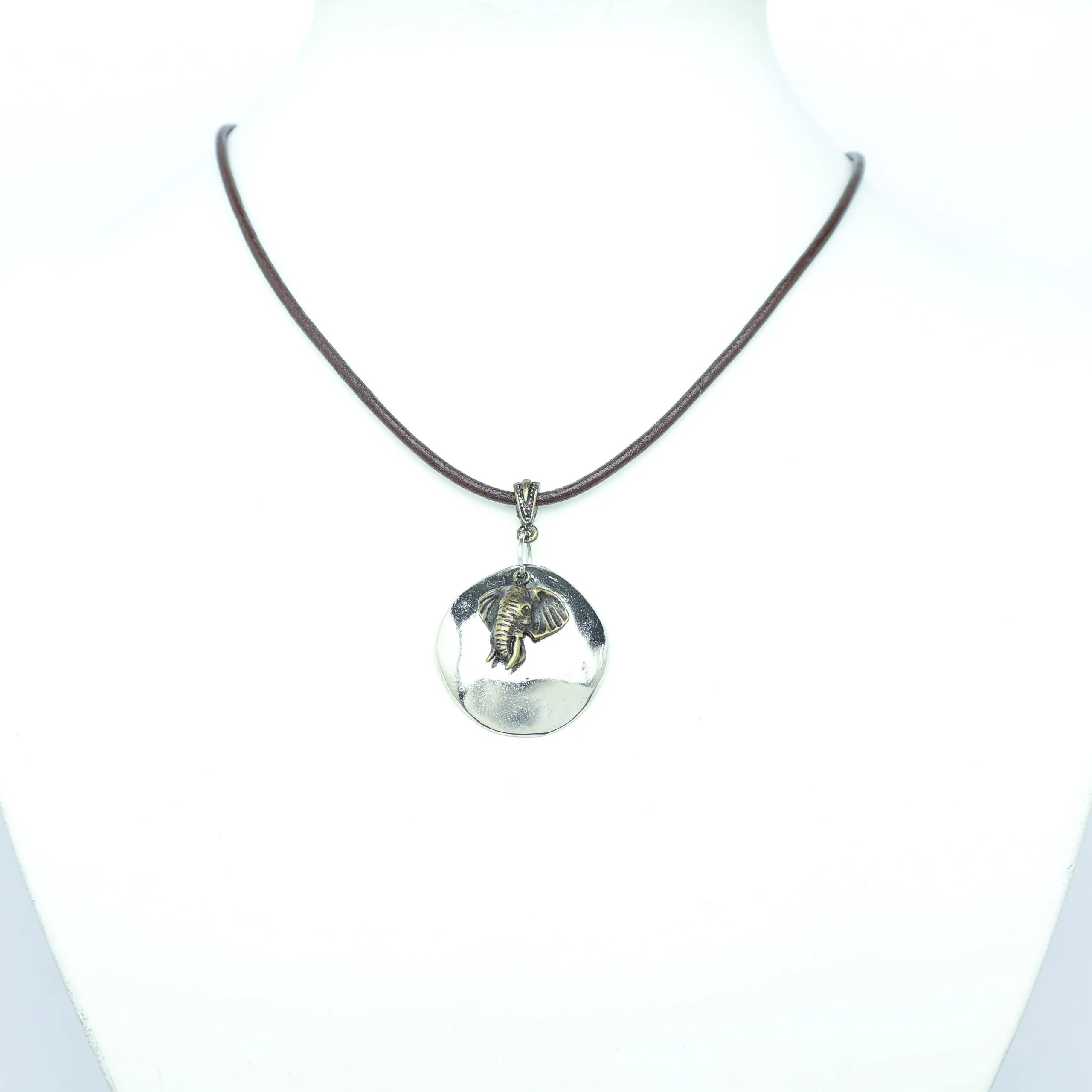 Leopardskin polymer clay, wood and antique brass on metallic leather necklace - NWE112