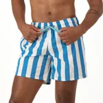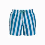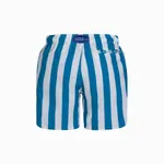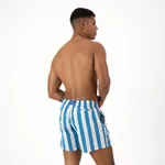 The swim shorts feature a bold vertical stripe pattern alternating between vibrant blue and off-white. The stripes are wide, giving the shorts a classic yet eye-catching appearance.