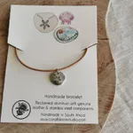 Our bracelets on genuine leather chord are made from reclaimed aluminum that is lasercut to size and shape. Each pansy is lovingly polished and assembled by hand.
