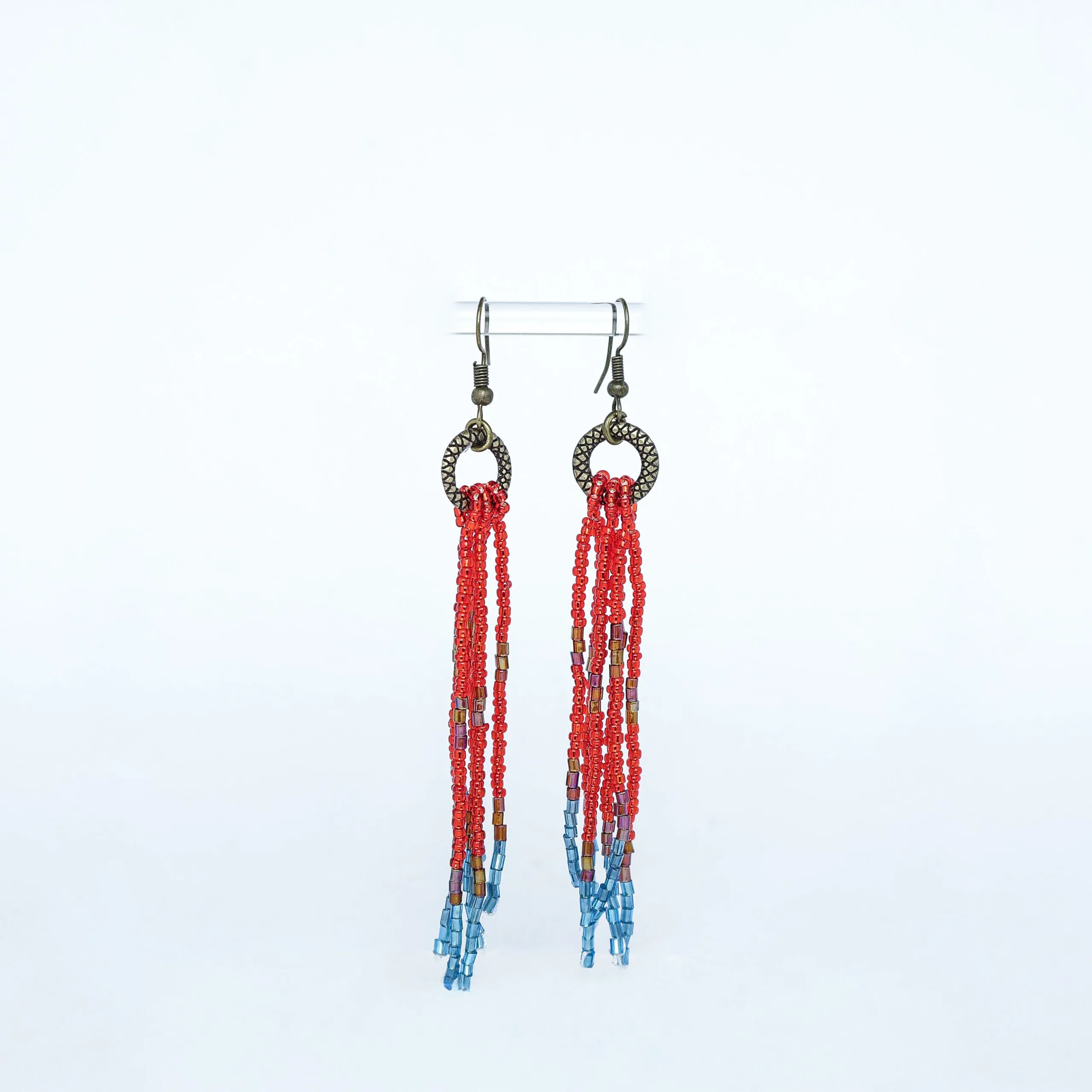 Fringe earrings using shades of blue and red seed beads on Antique Brass Hoops