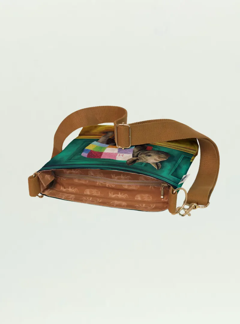 Crossbody sling bag with waterproof lining and detachable strap.