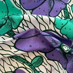 WHITE BACKGROUND ADORNED WITH BIG FLOWERS IN LILAC AND LIGHT EMERALD GREEN.THE OUTLINES ARE BLACK.