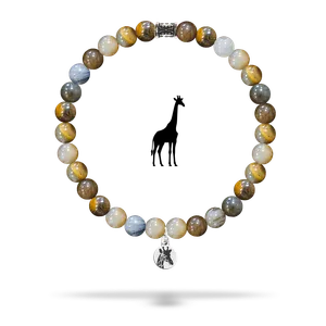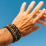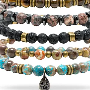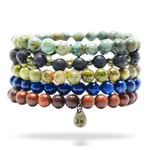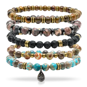 This stack of beaded bracelets are made up of semi-precious stones and wood bracelets that represent our founder Shannon Wild's favorite regions to work in as a National Geographic wildlife cinematographer and photographer. It’s a collection of beautiful greens, sparkling blues and earthy reds.