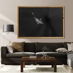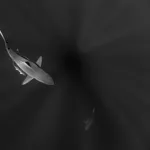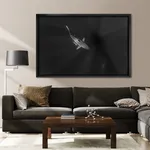 The contrast of the shark's velvet skin against the deep dark waters of the ocean is striking, and the rays of the sun shining down from above add an ethereal quality to the image. By capturing the shark from a bird's eye view, the photograph provides a unique perspective on this magnificent creature and highlights its graceful movement through the water. Through this photograph, the artist invites the viewer to appreciate the shark's natural beauty and to marvel at its strength and agility.