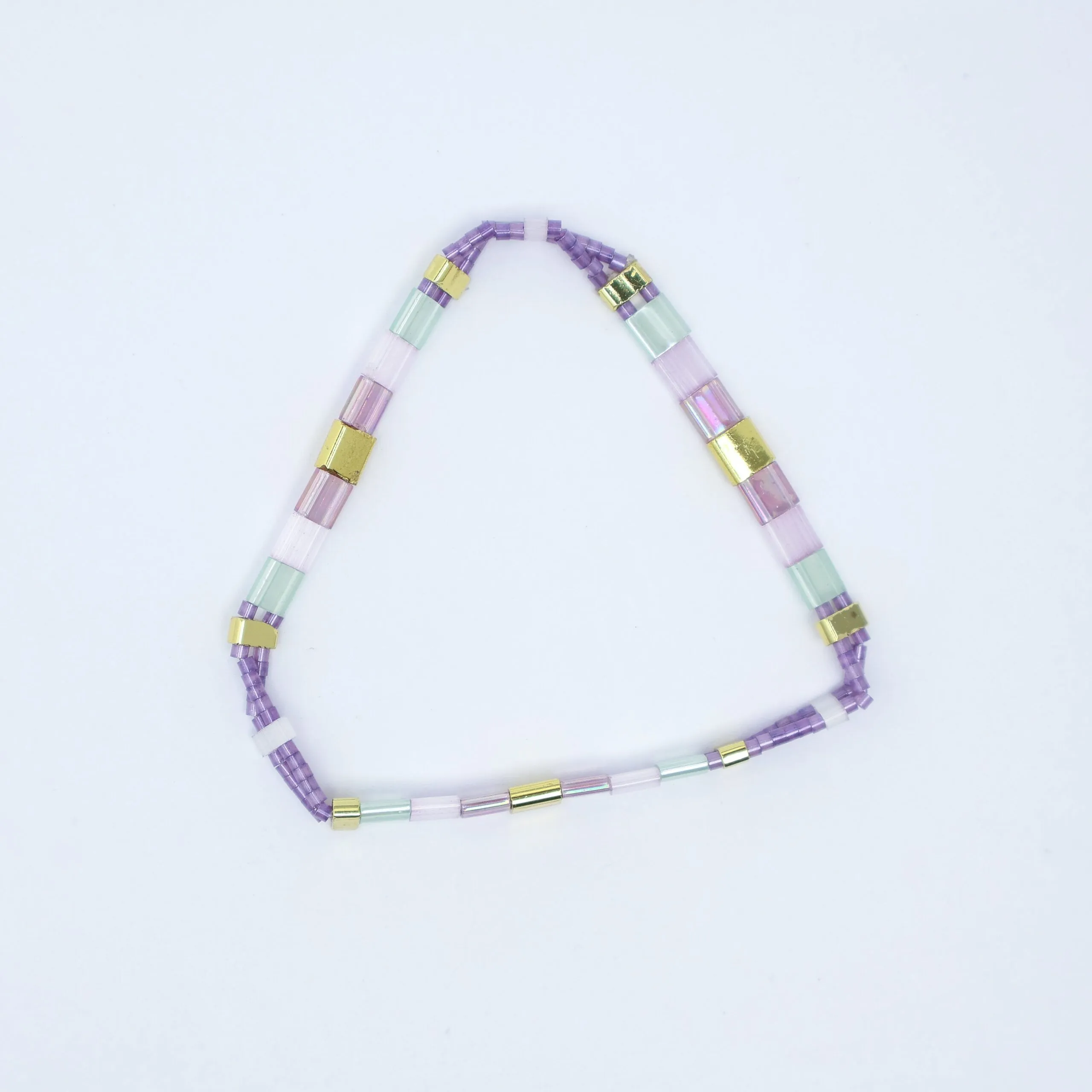 Purple, gold and green Miyuki Tila beads with purple seed beads