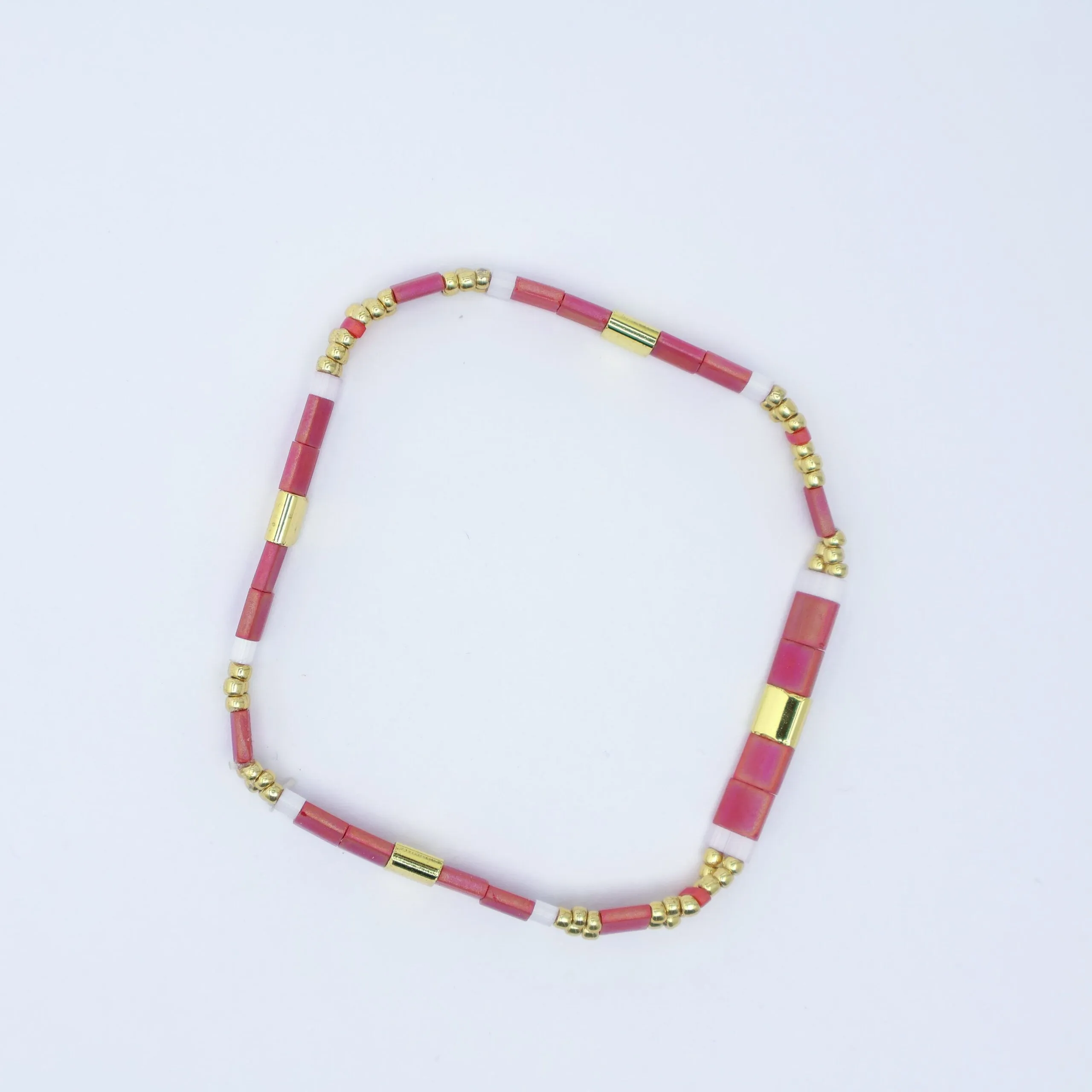 A bracelet made with matte pink and gold Miyuki Tila beads and gold seed beads