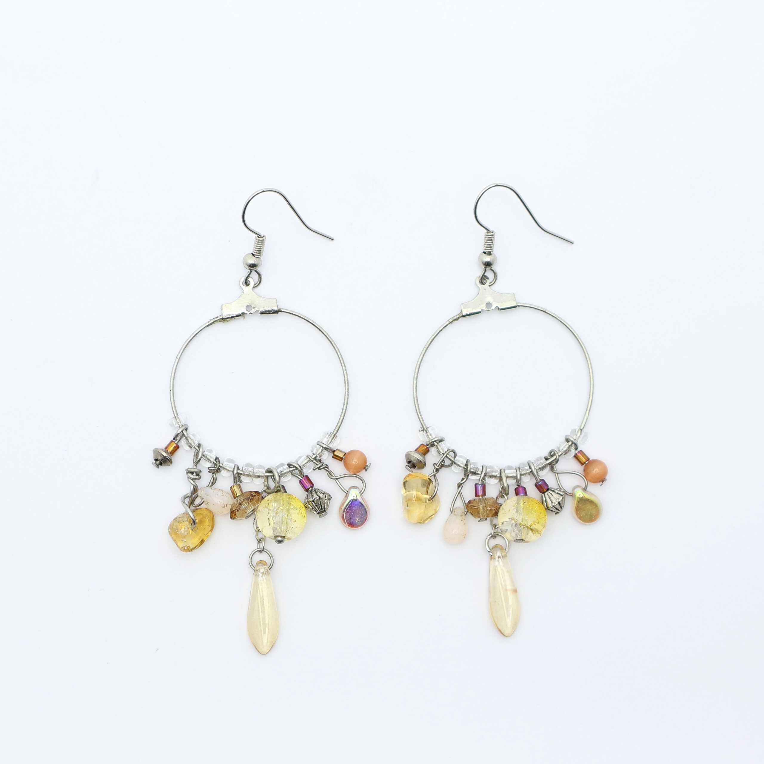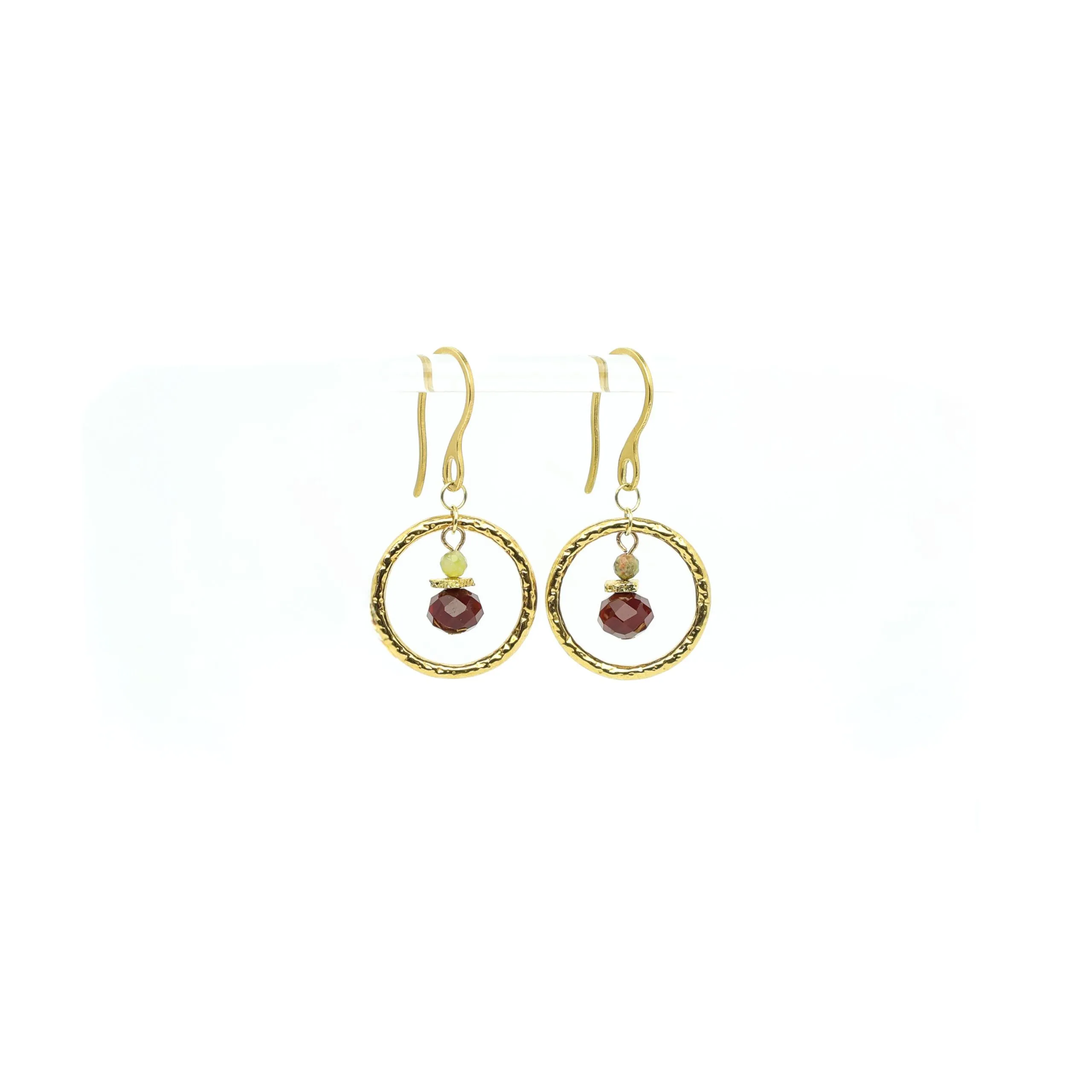Gold plated hammered hoop earrings with facetted unakite and other crystals