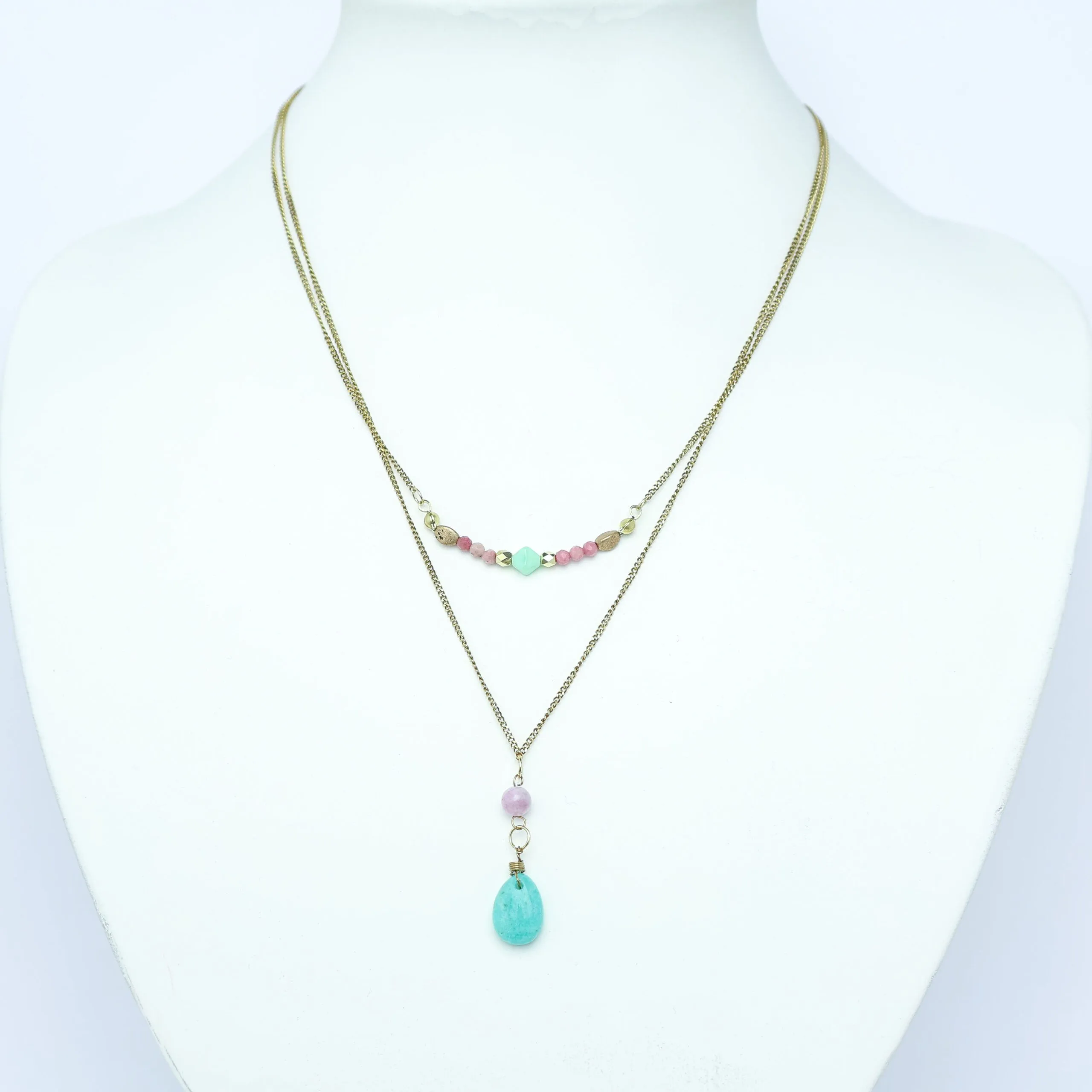 Two strands of gold plated chain with pink tourmaline, aventurine gemstones and Czech glass beads.