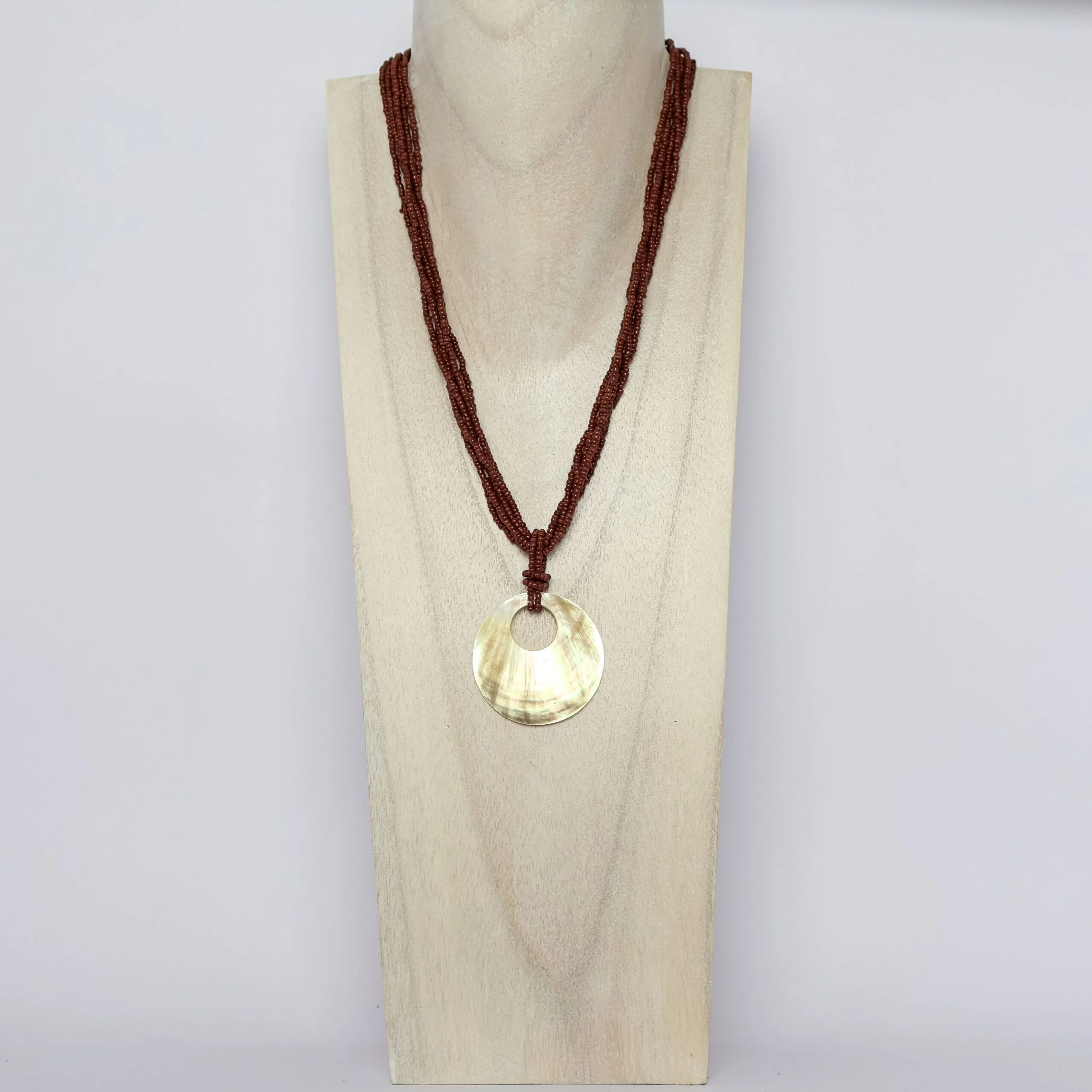 A necklace made with a twisted seed bead chain and a large shell disc