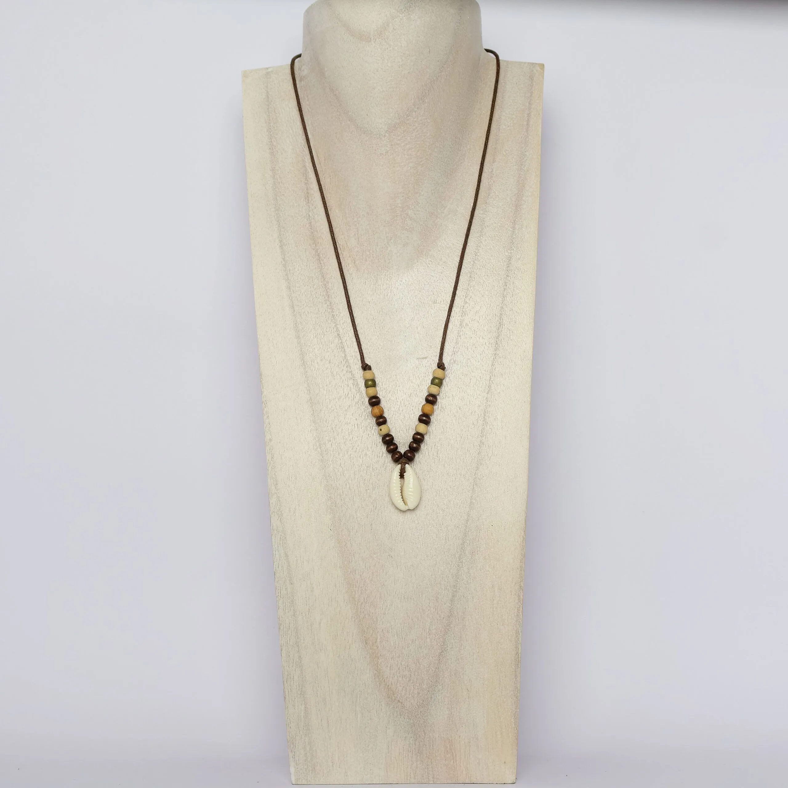 An adjustable nylon cord necklace made with wood beads and a cowrie shell
